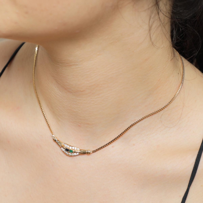 Collier maille anglaise en plaqué or zircone vert et bleu