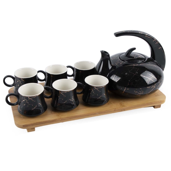 Ensemble de théière avec 6 tasses en céramique et un plateau en bambou – 9 pièces – Noir